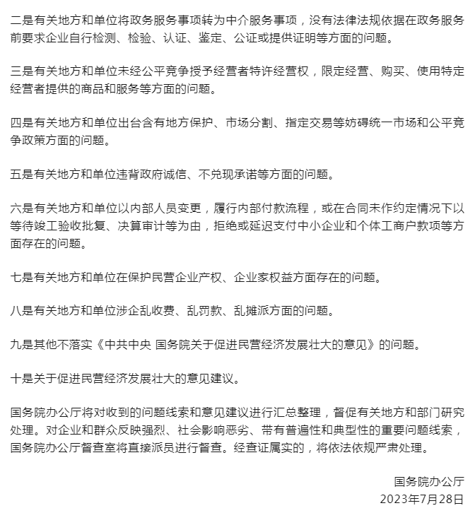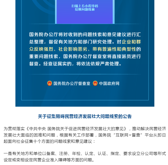 國務(wù)院“互聯(lián)網(wǎng)+督查”平臺公開(kāi)征集阻礙民營(yíng)經(jīng)濟發(fā)展壯大問(wèn)題線(xiàn)索