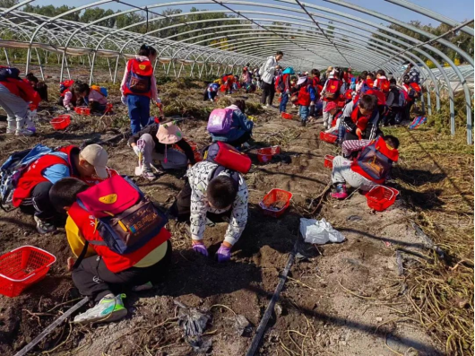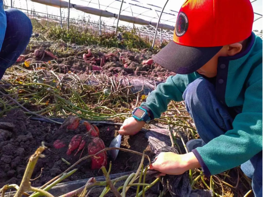 小朋友們在六十戶(hù)鄉塞外水鄉有機農場(chǎng)挖紅薯