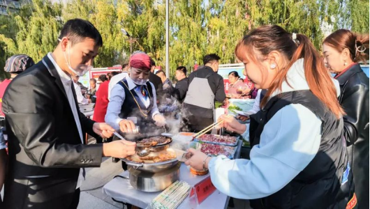 當天,社區20多家餐飲企業(yè)展開(kāi)美食大比拼,精心準備了50多種特色美食。展位上,素菜、葷菜、涼菜、熱菜應有盡有,圍觀(guān)的居民早早自覺(jué)排好了長(cháng)隊?!袄详?,你快點(diǎn)過(guò)來(lái),今天有美食節!啥好吃的都有,可熱鬧了!”居民王迎拿著(zhù)碗筷,趁排隊間隙打電話(huà)招呼朋友們趕緊參與活動(dòng)。