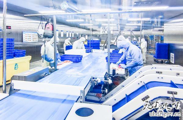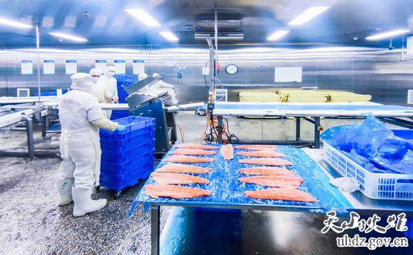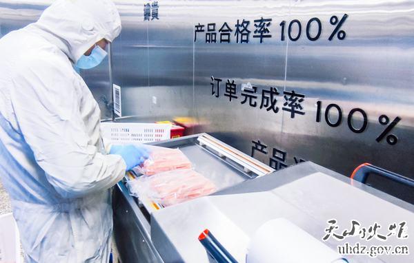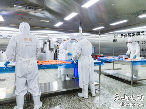 在高新區(新市區)科創(chuàng )谷,新疆鱒貴鮮食科技有限公司的車(chē)間內,工人們正對已經(jīng)切片的三文魚(yú)進(jìn)行無(wú)菌包裝。