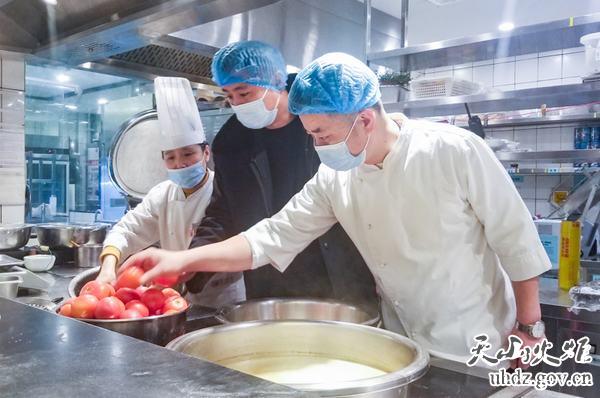 在該酒店后廚,市場(chǎng)監督管理局和海關(guān)工作人員對食品原材料采購進(jìn)貨票據、食品加工制作、餐飲具消毒、食物留樣、環(huán)境衛生、從業(yè)人員健康情況、疫情防控措施、進(jìn)口冷鏈食品管控等方面進(jìn)行了細致的檢查。食物取樣后,烏魯木齊海關(guān)技術(shù)中心檢測人員在安全快速檢測車(chē)上進(jìn)行專(zhuān)業(yè)快速檢測。