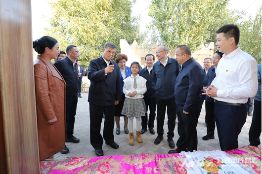 10月19日,尹力、馬興瑞、殷勇、艾爾肯·吐尼亞孜等在和田縣罕艾日克鎮稻香村看望基層群眾。石榴云/新疆日報記者 崔志堅攝