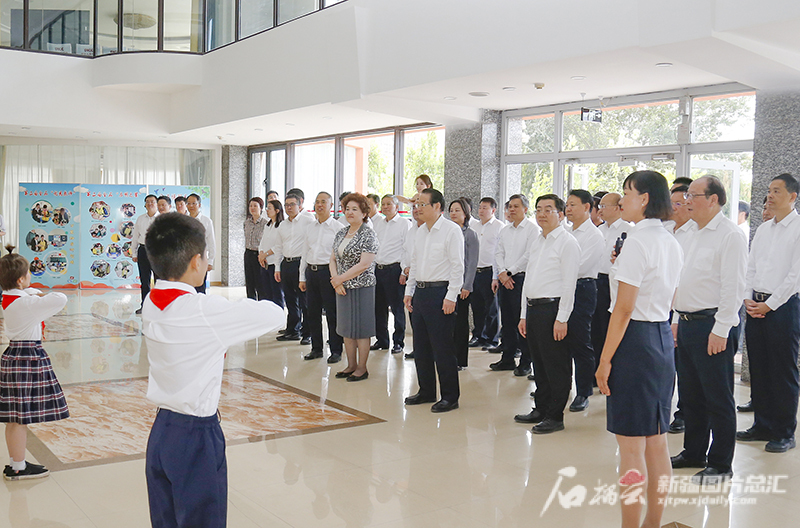 7月18日,馬興瑞、易煉紅、艾爾肯·吐尼亞孜等在兵團第一師阿拉爾市金銀川路街道胡楊社區調研基層陣地建設、加強民族團結有關(guān)工作。石榴云/新疆日報記者 崔志堅攝