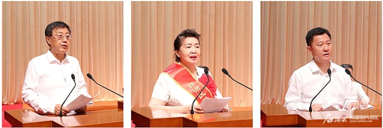 會(huì )上,武鋼(左)、瑪依努爾·尼牙孜(中)、劉洪濤分別代表自治區科學(xué)技術(shù)獎獲獎單位、自治區科學(xué)技術(shù)獎突出貢獻獎獲得者、青年科技工作者發(fā)言。石榴云/新疆日報記者 謝龍攝