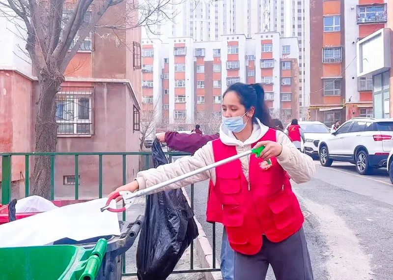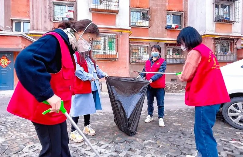 志愿者在社區開(kāi)展環(huán)境衛生整治
