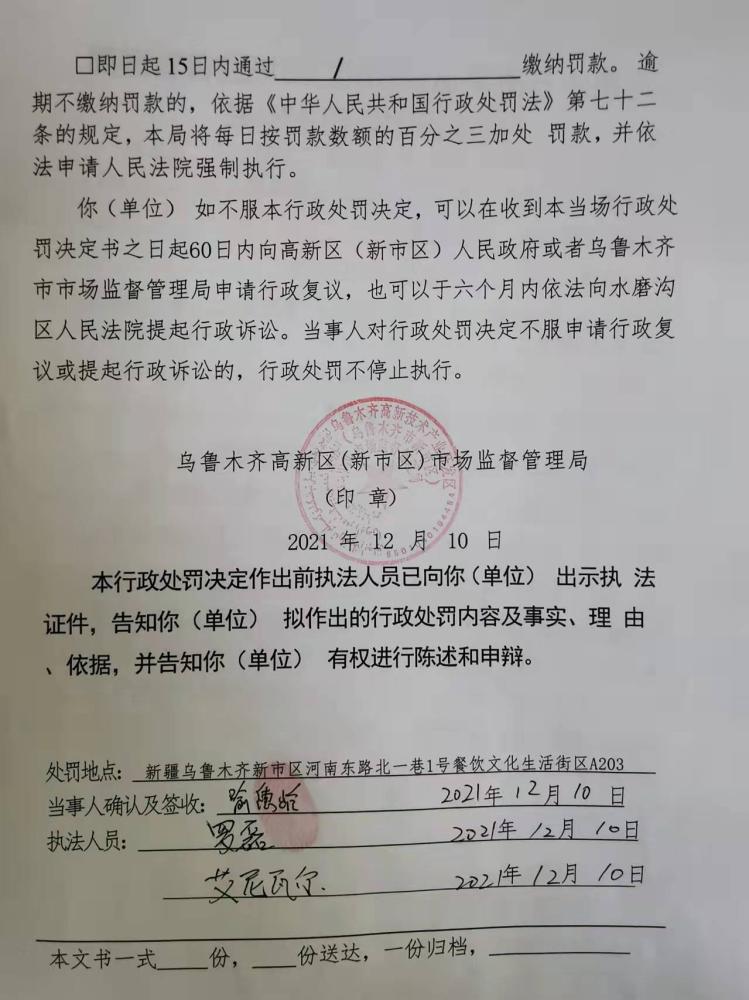 《當場(chǎng)行政處罰決定書(shū)》文號:烏高(新)市監食當罰〔2021〕50號。
