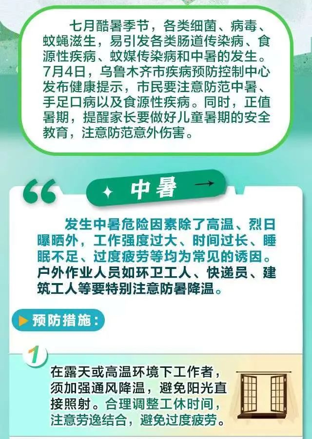 【提醒】烏魯木齊市疾病預防控制中心發(fā)布健康提示:市民要注意防范中暑、手足口病以及食源性疾病
