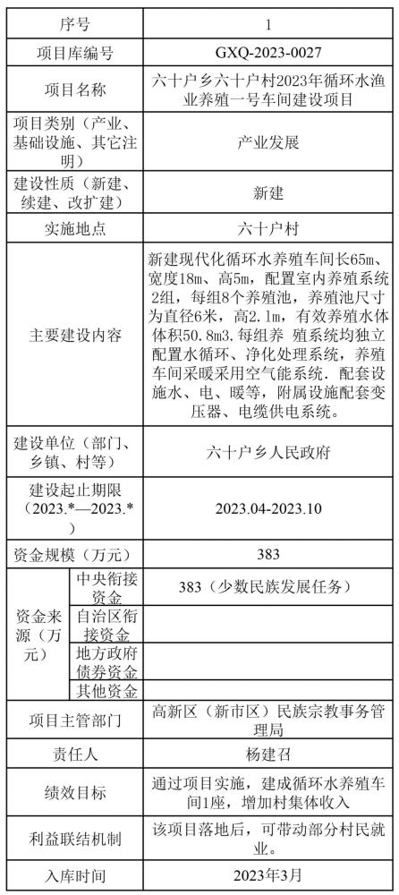 根據烏魯木齊市農村工作領(lǐng)導小組暨鄉村振興領(lǐng)導小組工作安排,按照加快項目建設工作進(jìn)度,謀劃一批可實(shí)施、可落地的項目要求,根據我區產(chǎn)業(yè)發(fā)展實(shí)際,經(jīng)六十戶(hù)村、六十戶(hù)鄉、區民族宗教事務(wù)管理局申報,經(jīng)區委農村工作領(lǐng)導小組暨鄉村振興領(lǐng)導小組辦公室研究,同意六十戶(hù)鄉六十戶(hù)村2023年循環(huán)水漁業(yè)養殖一號車(chē)間建設項目入庫?,F對入庫項目進(jìn)行公告。