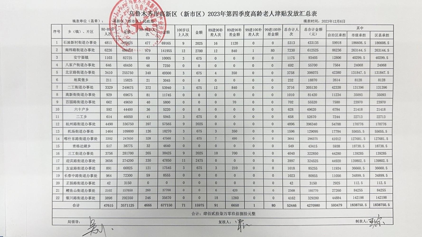 高新區(新市區)2023年第四季度高齡老人津貼發(fā)放匯總表